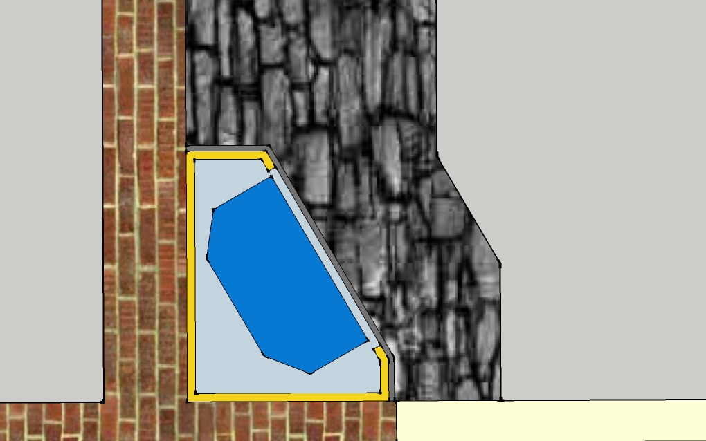 Обмислям ето тоя вариант - камината завъртяна на 45 градуса. Настрани не знам какви излъчвания има, но се надявам така завъртяна да е по-безопастно за прозорците. По сметки са 7см между топлоизолацията и обшивката на камината. 3см е дебелината на каменната вата. По-малки са разстоянията само при задните ръбове на камерата - 3см.