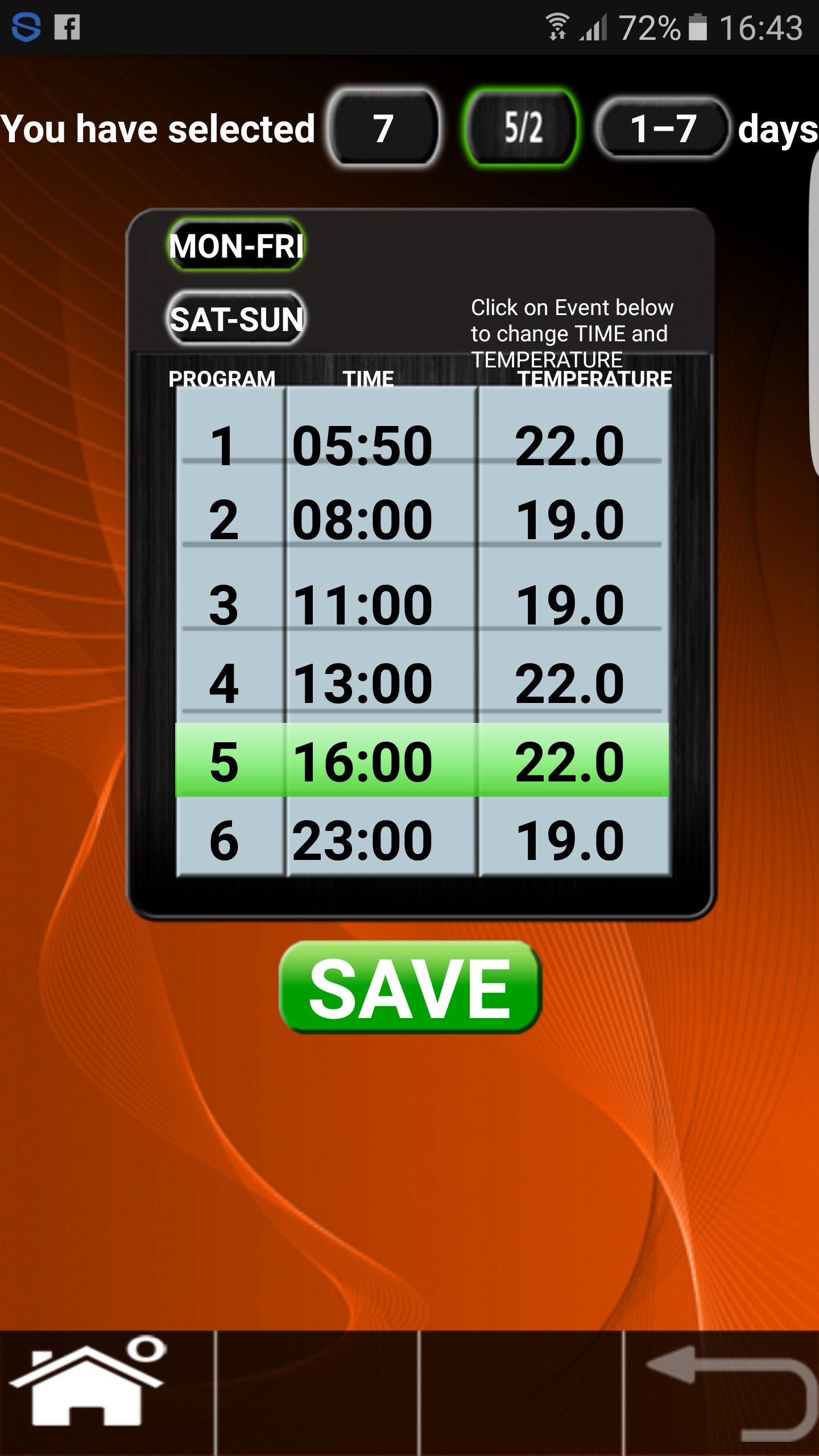 Т.е. една и съща настройка за 7 дни; настройка за 5 делнични и два почивни дни; настройка за всеки ден от седмицата. Да не би нещо от там да е. При мен работи абсолютно коректнo.
