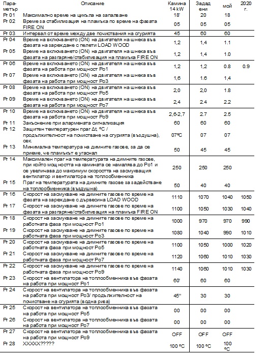 Благодаря!Но искам да вляза в UT04: Вход към сервизното меню , за на намаля оборотите на вентилатора , тъй като при мен пламък почти липсва,горенето ми е като на горелка ,а трябва да е като на факла.А и за да сравня , Рr1...Рr22 .Благодаря предварително.