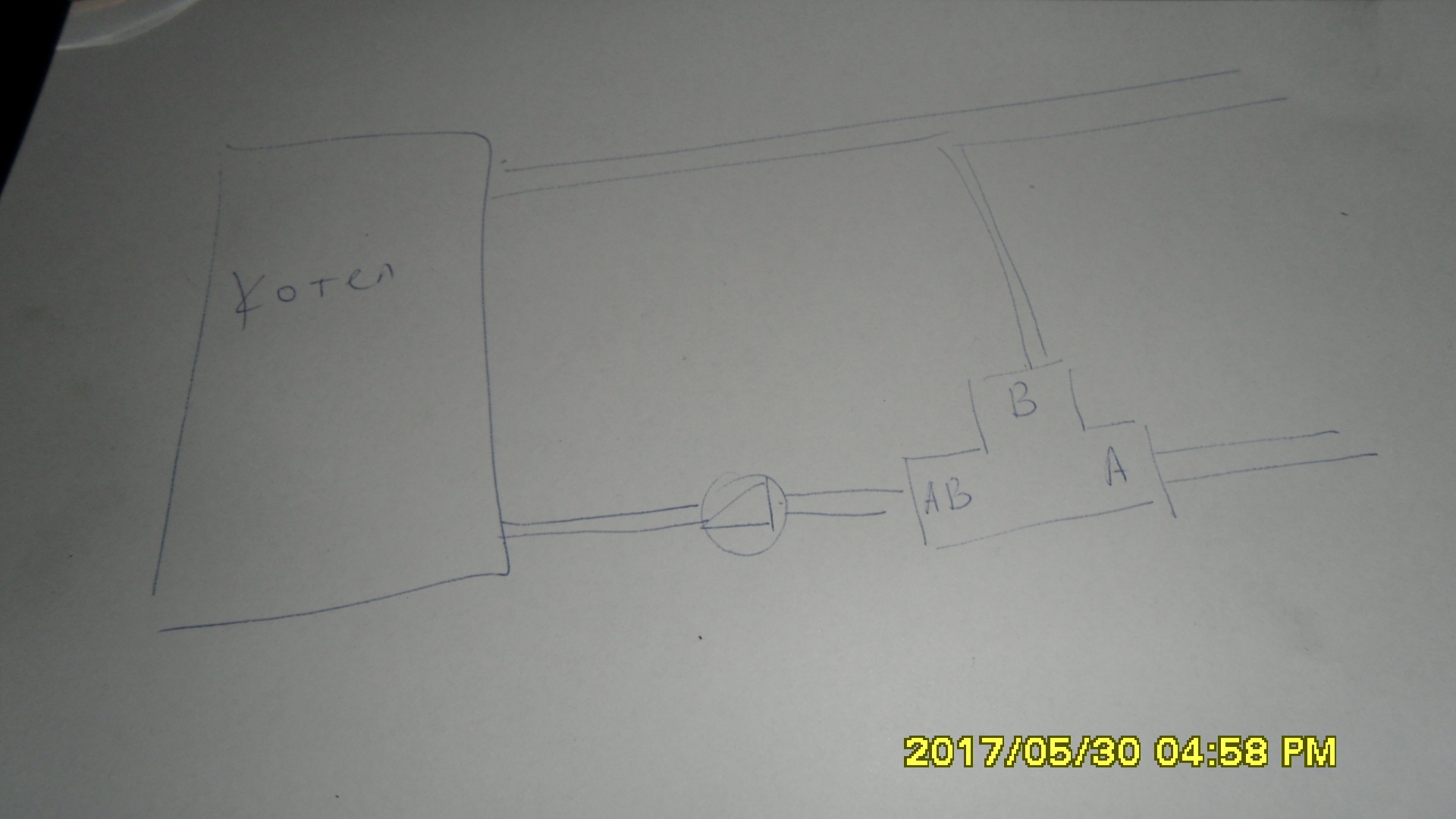 Леле майко, ти отдавна си написал кое какво означава и как си го сложил. А е затворен. Значи АВ към котела и А към радиаторите. Еми да, това ти е играта