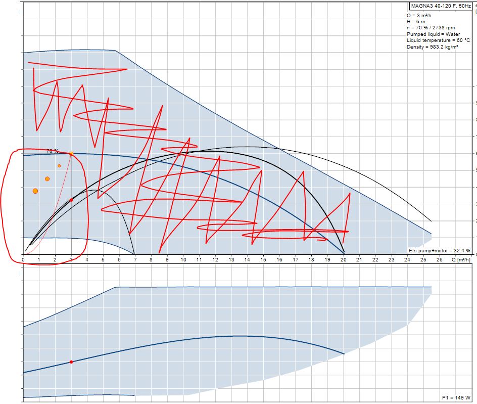 Още веднъж да попитам - тази помпа не е ли прекалено голяма? При максималния теоретичен дебит необходим за 60 kW котел - 3м3/h (т.е. повече не ти трябва защото с този дебит можеш да доставиш цялата котелна мощност) тази помпа има напор от 10 м, което е голямо за коя да е инсталация с такава мощност. Както се вижда от графиката на помпата работната й част е в ляво, което показва, че е доста по - голяма от необходимото. Вижте и общото КПД на помпата долу в десния край. Помпата е подбрана правилно когато работната и точка се намира някъде в средата на графиката и КПД е доста по - голямо. Вярно е че Magna 3 е електронна помпа и ще регулира дебита и напора, но защо да се дават излишни пари?