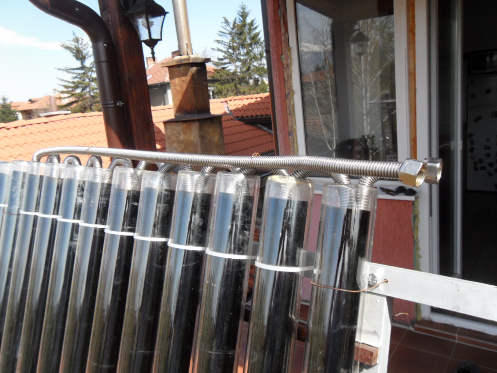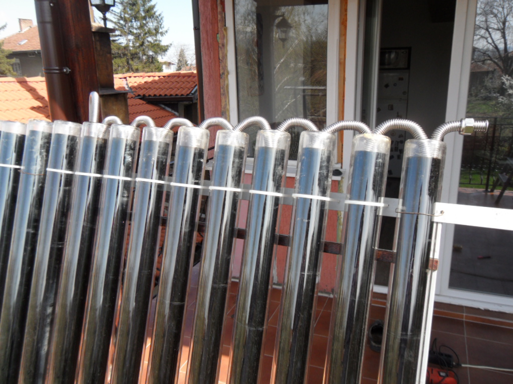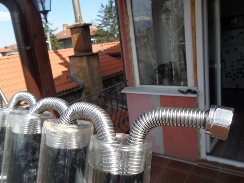 1/ неръждаемата тръба ще стига до дъното на вакумната тръба, за да не отнема само топлина от горните 50 см на вакумната тръба. Така ще се повиши КПД то на системата, защото в момента в горната част на тръбата е около 60 градуса, а в долната над 110....термометъра ми е до 110 градуса.
