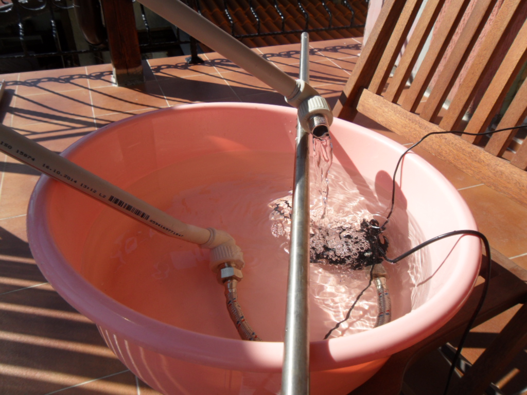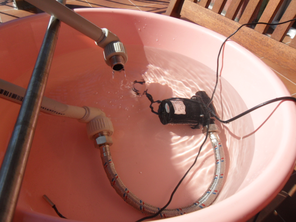2/ Ще направяколектор с 3/4" или 1" от който ще тръгват 1/2' U тръби по 1.8м. Въпреки, че меките неръждаеми тръби са с голямо вътрешно съпротивление една маломошна 12 волта, 10.8 вата китайска циркулационна помпа с 3м напор работи перфектно, като дебита е сериозен и се вижда на снимките. Даже се замислям дали една китайска помпа 24 волта. 3.6ампера с напор 15 метра може да върти меандър със 108 метра 1/2 неръждаема тръба в 30 тръбна система....не пречи да опитам. Имам наличните елементи.