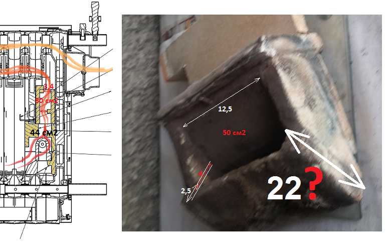 Гледам, на Виадрус 20kW хората са оставили отвор за огъня най-малко 43 см2. Това е в мястото където се подава вторичен въздух и се охлаждат плочите, първата едностранно от въздуха, втората от водната риза зад нея.
