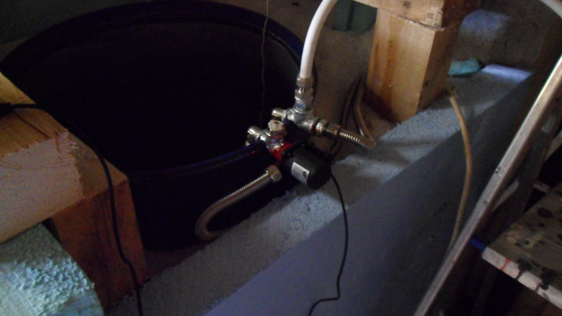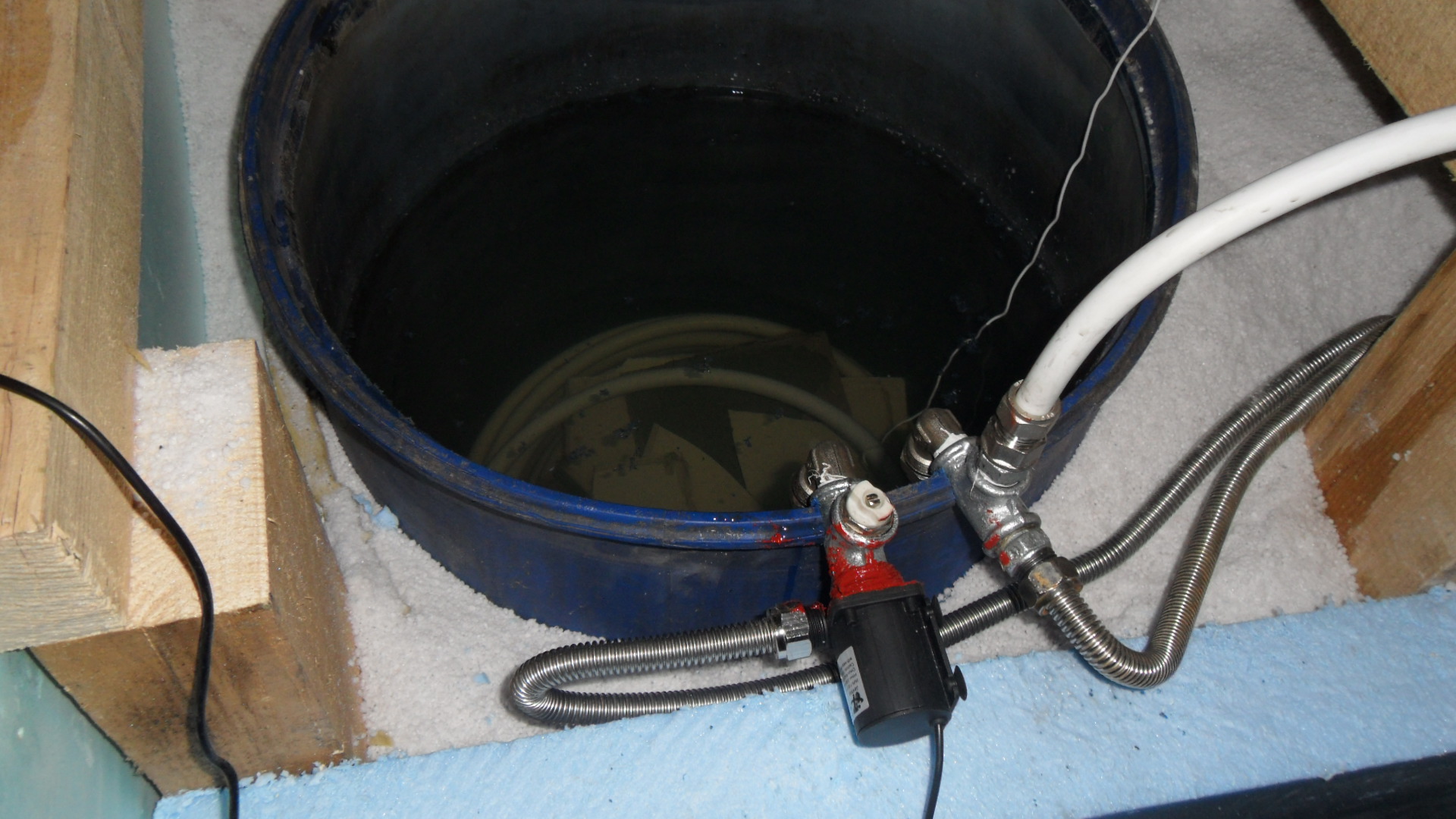 Буфера е от 240 л. пласмасов бидон за 30 лв в който са монтирани 2 бр серпентини ф 20 х 100 м. от тръба Рх с ал. вложка за по 85 лв за 100м.