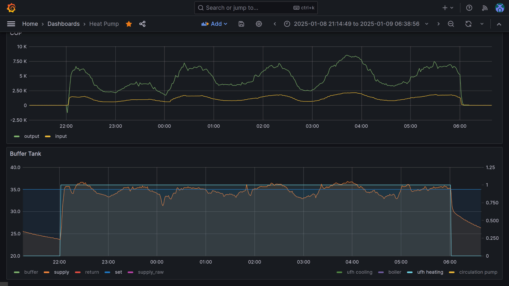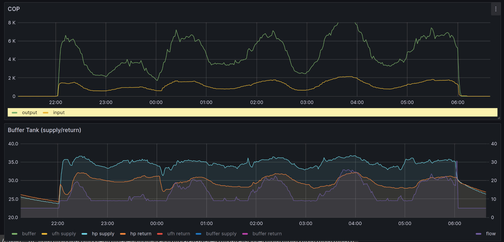 Ей ти две графики от мойта дето се виждат температурите дето подава, температурата дето се връща към нея и дебита на помпата. И е видно как си намаля мощността, за да поддържа постоянна температура на изхода. Това е от последните топли дни, че сега дефроста бърка картинката.