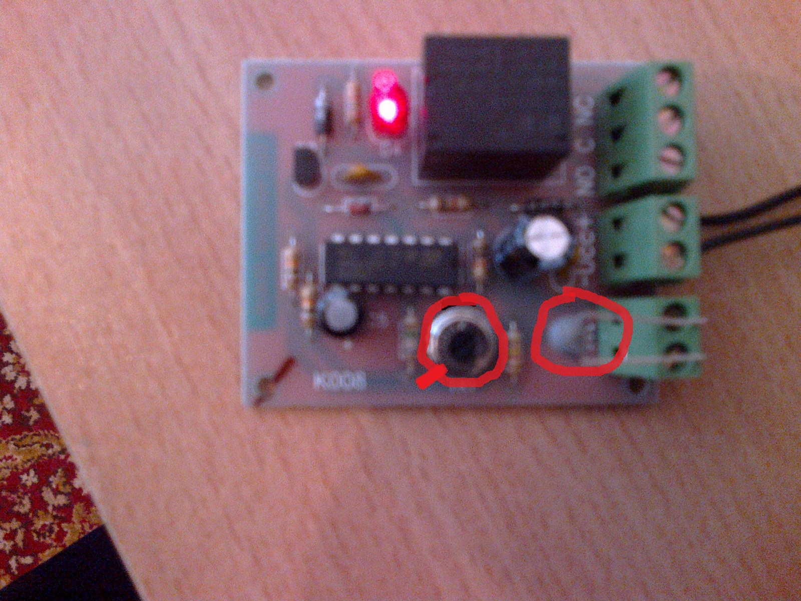 Днес пуснах 11V DC на платката и пак същия резултат. Има контакт м/у C и NO, а не м/у NO и NC, въпросния датчик който е сложен в комплекта (да ли вообще е датчик или аз трябва да си сложа някакъв), колко и да го нагрявам и да го топля диода свети само в едно положение, когато тримера е в крайно ляво положение т.е на 5оС или изключен. Моля някой да помогне!!! Ето и снимка с яервено съм оградил въпросния датчик (ако вообще е датчик) и тримера, като съм обелязал къде свети диода.