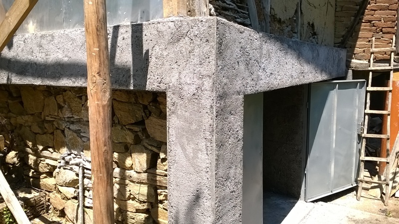 Бетонните пояси и колоната,с които укрепиха къщата измазахме с ТИВИТ и завършихме с пръкана мазилка.