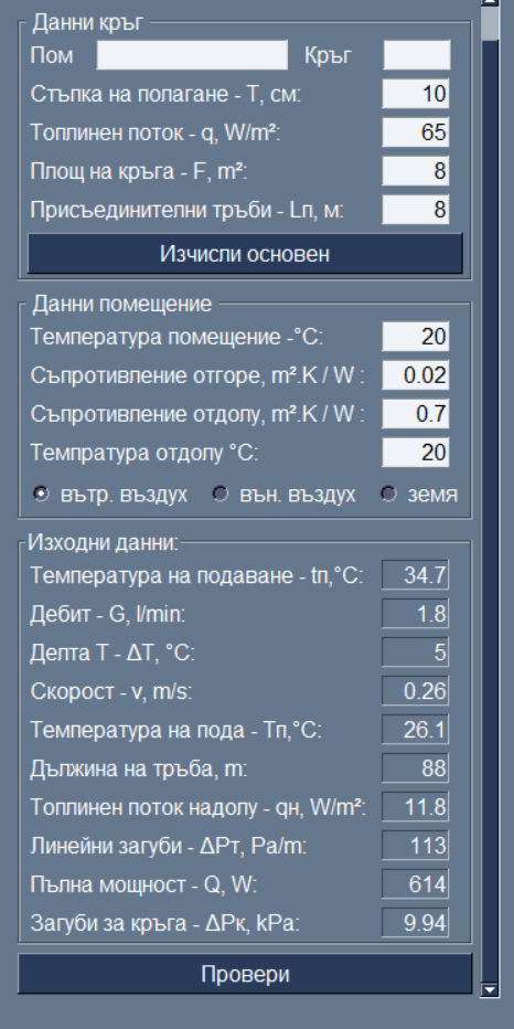 Да сложим малко запас от 10 процента. Получава се около 63 вата на квадрат - да го зкръглим на 65. Хубаво щеше да е стая по стая за да се види най - натоварения кръг, но .... и така ще е ориентир. Та за 65 вата, стъпка 10 и плчки за -15 ще ви трябва 35 градуса подаваща вода. Топлинния поток надолу за 2 см фибран и отдолу отопляемо ще е 12 вата на квадрат. Ако направите кръг с площ 8 квадрата - картинката, всички данни са там.