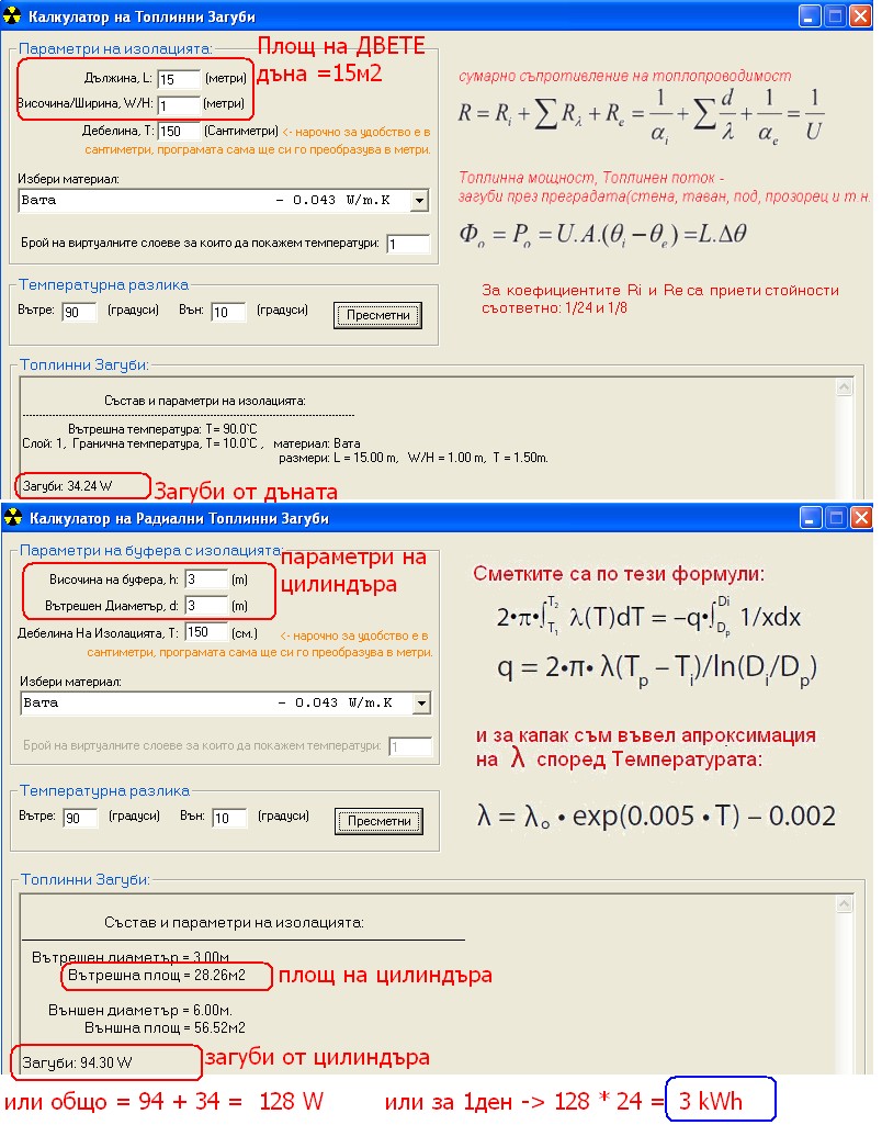Значи задание: Буфер диам.3м височина 3м, dT=80`C, изолация дебелина = 150см, lam=0.04