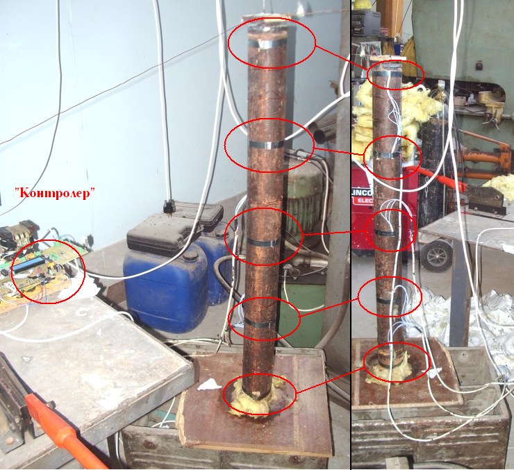 Реших аз навремето да проверя нещата на практика. И взех аз една тръба напълних я с масло забих и един реотан и я накичих с температурни датчици, отбелязани със кръгчета в червено: