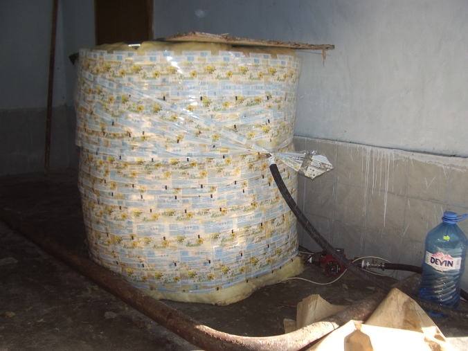 И така на всеки три дена овивам вата върху тръбата и тест за загуби на топлина, първо един слой, върху него втори, и още и още :-D , мечо пух край няма: