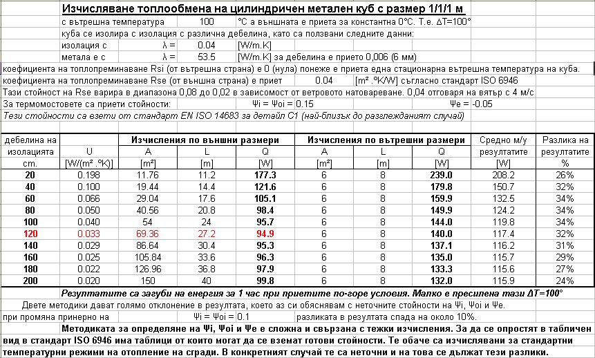 В началото аз писах, че личното ми мнение е, че е по-вярно да се смята по вътрешни размери, точно за това, че при тази методика няма такива необясними минимуми и второ, получават се по-големи загуби. На теория те трябва да са еднакви при коректно приети стойности на Ψ, но на мен не ми се изчисляват. По-лесно ми е да взема готовите от таблицата на стандарта, а и предпочитам да се запасявам, като вземам по-лошите стойности от изчисленията.