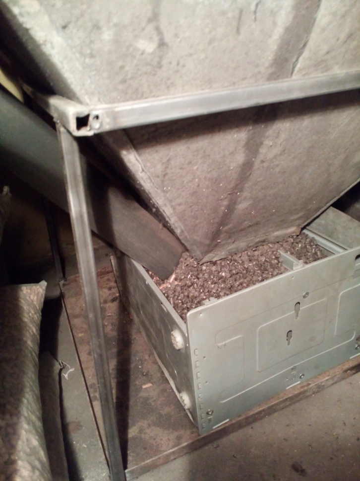 Бункера е до нивото на чекмеджето което е поставено отдолу. Когато се изпразни по лесно се почиства от пепел, който малко или много го има в пелетите. На една от снимките е част от разпределението на инсталацията - правена е 2003 лично от мен и съпругата ми. Бели труби и фитинги - досега не е прокапало никъде. Тайната за това - всички фитинги са сглобявани с течен тифлон, както метал-метал, така и метал-тръба. Миналата година минах на пелети и слагах термоглави, установих, че сегашния течен тифлон е по калпав.