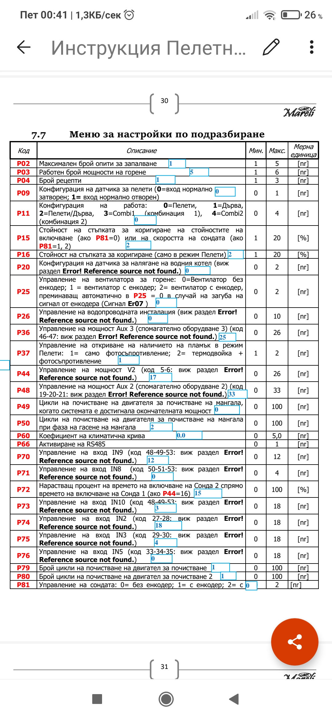 Р81 е управление на сондата, ама имат предвид шнека, т.е има ли енкодер на мотора на шнрка или няма и бачка по време, при тебе няма инак треба да настройваш обороти за минута не времена за шнека.Не е чак толкова добра горелката , че да има и енкодер на шнека и да цепи градуса на оборот..