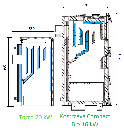 Котелът е Kostrzewa Compakt Bio с ламбда контрол Съпоставяме двата котела визуално и по размери На височина Торч е видимо по-малък. Широчината на Торч също е по-малка от Kostrzewa с 25%. Торч е широк 40 см. Kostrzewa 51 см.