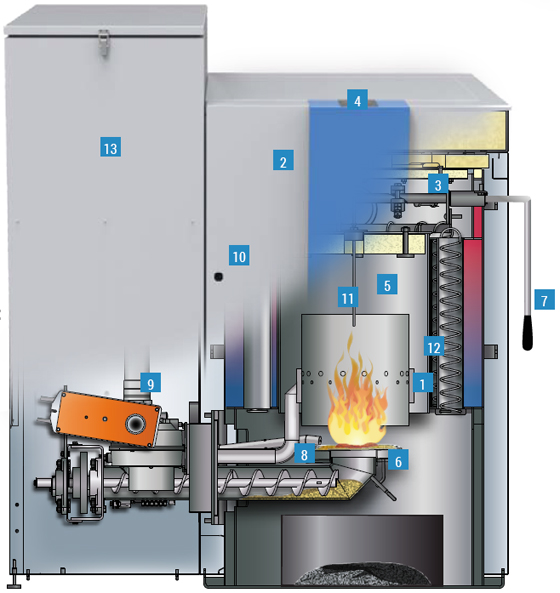 При първичното изгаряне пелетите се подават отдолу на горелката, без да смущават по този начин самия горивен процес. Образувалите се при това изгаряне дървесни газове се издигат до вторичния горивен цилиндър, където се инжектира допълнителен въздух и сместа от дървесни газове гори при около 800°C. В действителност, това е модулираща газова горелка, която използва дървесните газове. Тези горещи газове циркулират още веднъж около горивния съд осъществявайки допълнителен горивен процес, а след това се отвеждат, като отдават през топлообменика своята енергия на водата за отопление.