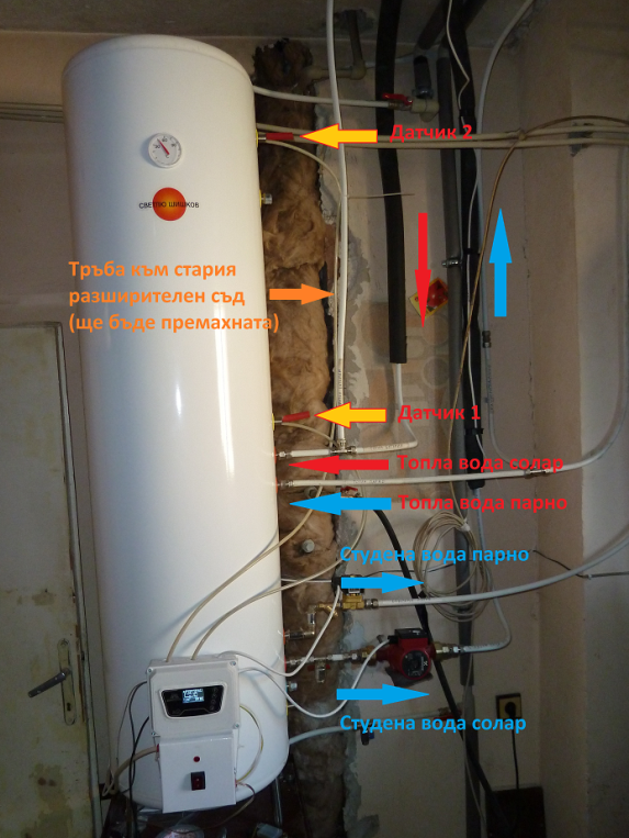 Вчера при мен беше 55 градуса в бойлера долу, и 55 градуса в бойлера горе. Помпата беше спряла в 18 часа, като се прибрах.