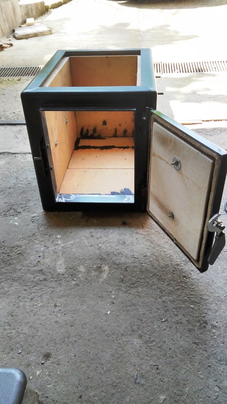 Кутията е изолирана от трите странични страни с огнеупорни тухли см, остава да сложа вермикулит на вратата и да наредя огнеупорни тухли на пода( мисля 2см).