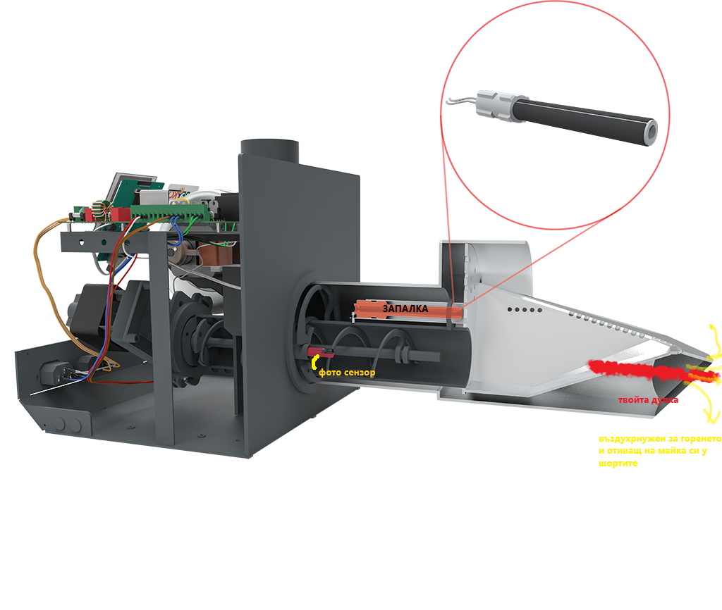 filmatoplo написа:През малкия шнек ли .клетката е извън тръбата от дясно .напред не вижда реална светлина ами отразена .Ама вие май наистина не знаете какво ползвате - грейкото няма ли 2 фотосензора - един покрай пружината на малкият шнек и втори на тръбата за постъпване на пелети към малкият шнек - служи за да не се препълва/задръства / тръбата за вход на малкият шнек - от другата страна , трябва да е термичната за обратен пламък!
