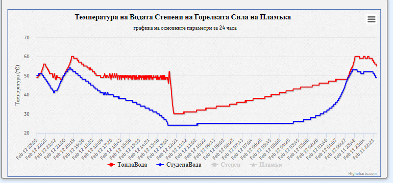 Червената линия е темп на котела, а синята на буфера ми към подовото. (може да се кликва върху графиката и оставят само някои от параметрите)