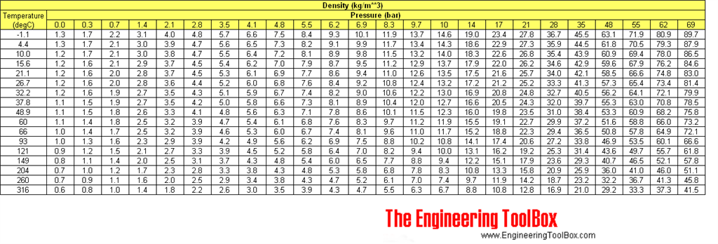 Избрал съм произволни стойности от тази таблица, че по-добра не намерих, но те са само за илюстрация така ще свърши работа за подкрепа на разсъжденията ми. Разглеждам пример за 100литра разширителен съд и отчитам данните за въздух при 10градуса. Начално налягане на инсталацията (пълначката) = 1,4bar плътност 3kg/m3