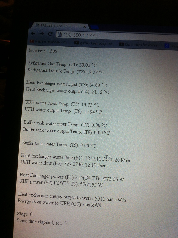 На снимката е какво изкара термопомпата и дебитите на водата през подовото и през термопомпата. Снимано е в мазето и с телефон и затова е малко грозна но се чете. Това е при студено подово, не е загрявано преди и са малко ниски температурите на водата из системата. Мисля, че като се вдигне до работната няма да се променят драстично мощностите които изкарва системата.