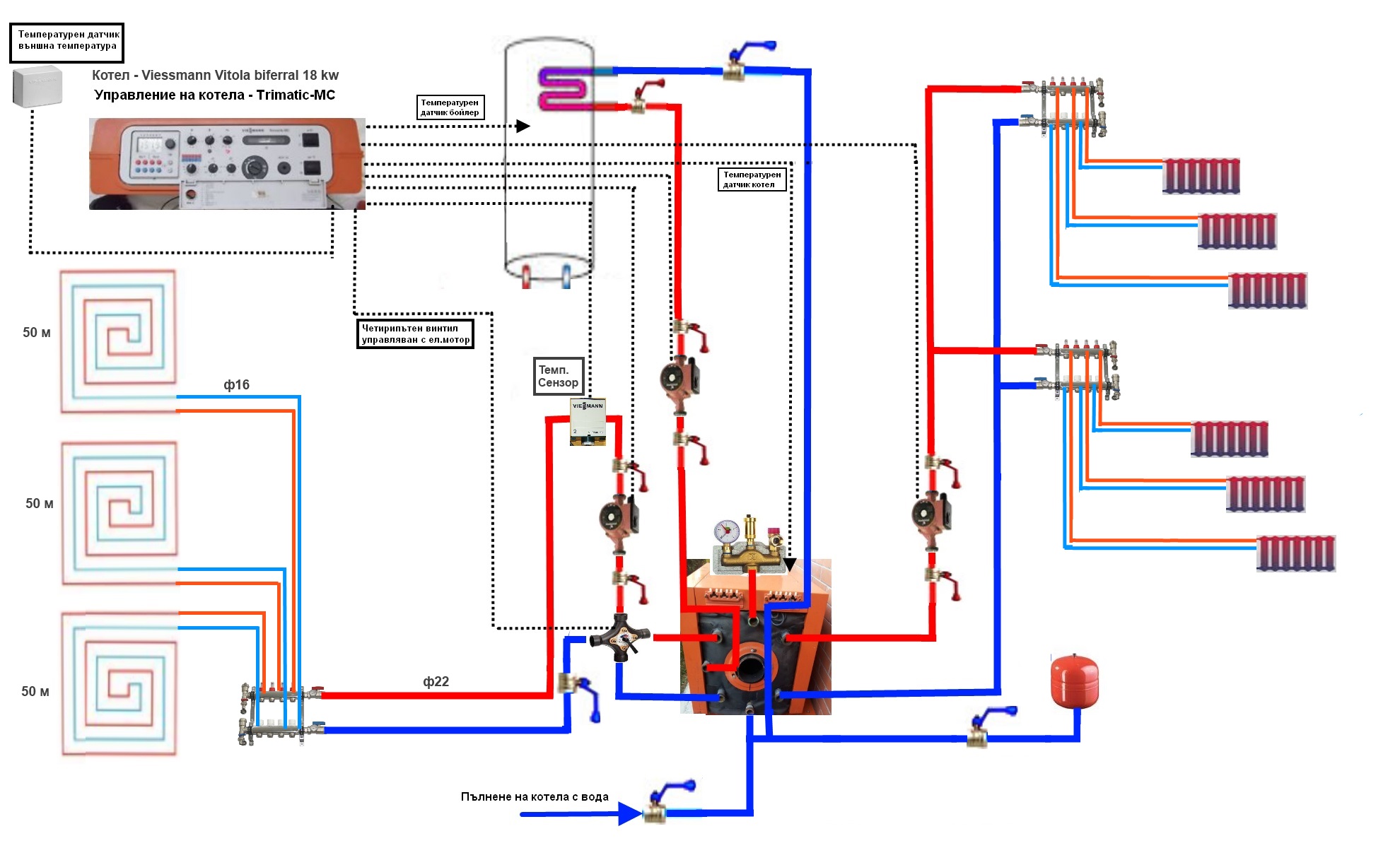 предстои ми изграждане на парно, като за целта имам котел с горелка на нафта/газ, който мисля да използвам котелът е Viessmann vitola biferral 18kw. Порових се доста във форума и успях да направя следната схема на инсталацията, която е съобразена и с примерните схеми дадени с котела. Останаха някой неща, с които не успях да се справя и за които се надявам някой да помогне със професионален съвет. Програмирането на котела се надявам да успея да го направя сам по документацията, която върви с него. Пускам и схемата, по която мисля да изпълня инсталацията и, по която имам няколко неизяснени въпроса?
