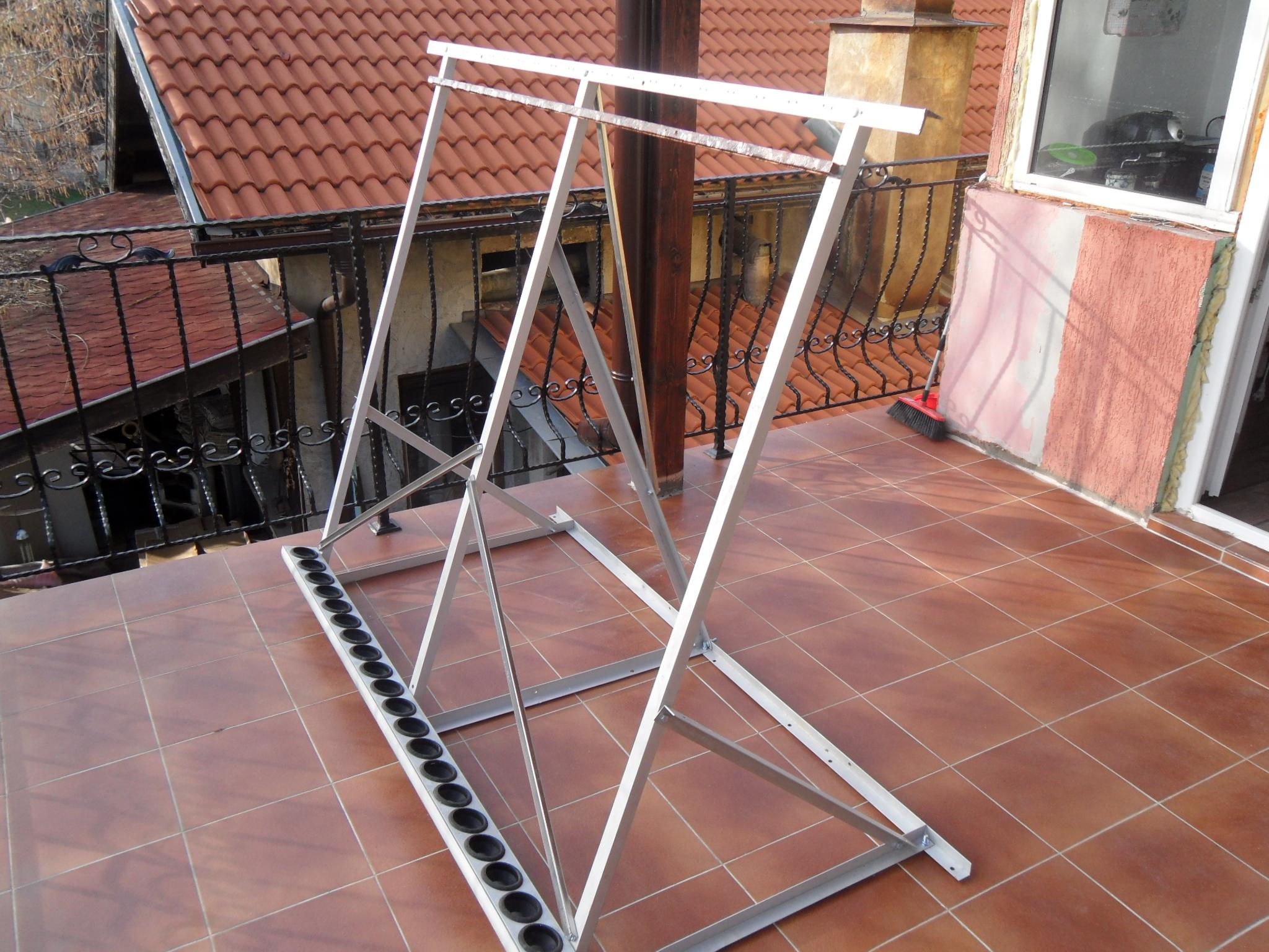 SAM_7300.JPG стойката е готова за монтаж на вакумните тръби. В горната част съм приспособил ивица гуменотекстилна транспортна лента с легла за тръбите