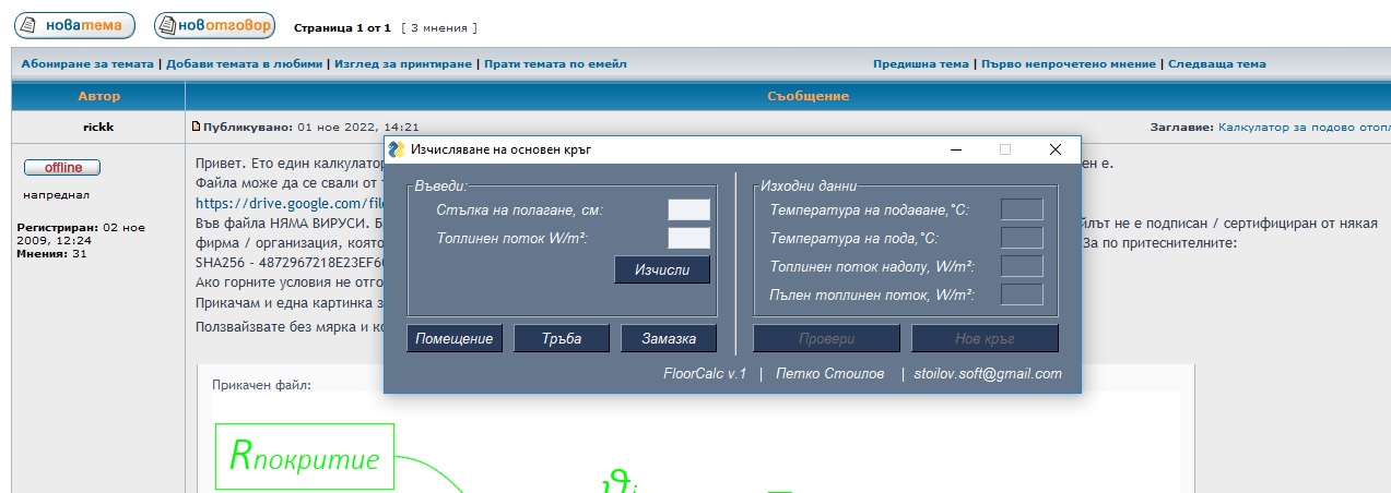 Привет. Ето един калкулатор за подово отопление, който е лично творение. Ако на някой му е полезен, може да го ползва - безплатен е.