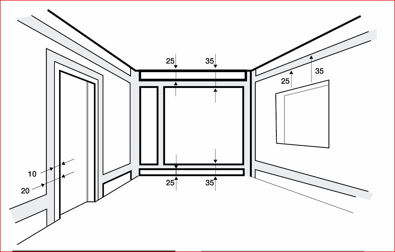 3. работим по снимката по долу. Кабелите минават по сивата част на снимката. Най лесно е когато има висящ таван, а това е почти винаги.