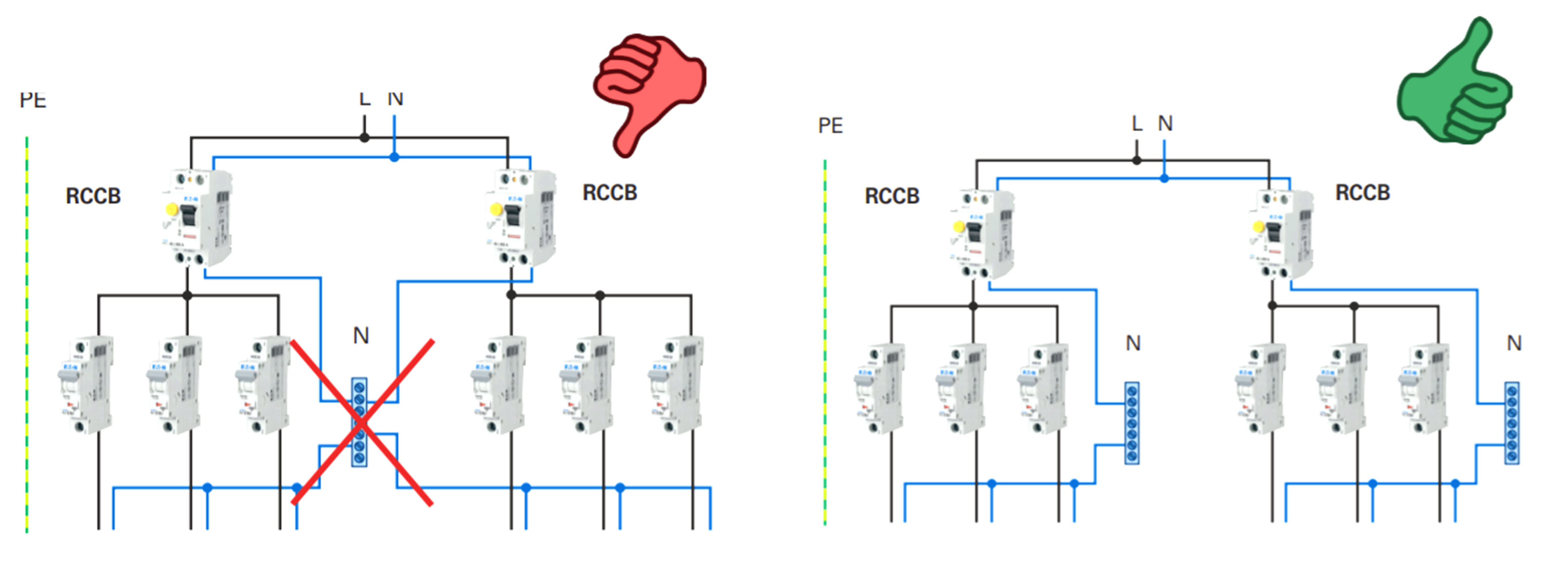 Затова Blue e дал препоръка да не се ползва едно „главно“ RCD(ДТЗ), а няколко (за най-критичните кръгове). RCD(ДТЗ) са отдалечени от ГЕРТ и монтирани в подтабла, колкото е възможно по-близо до съответните контакти.