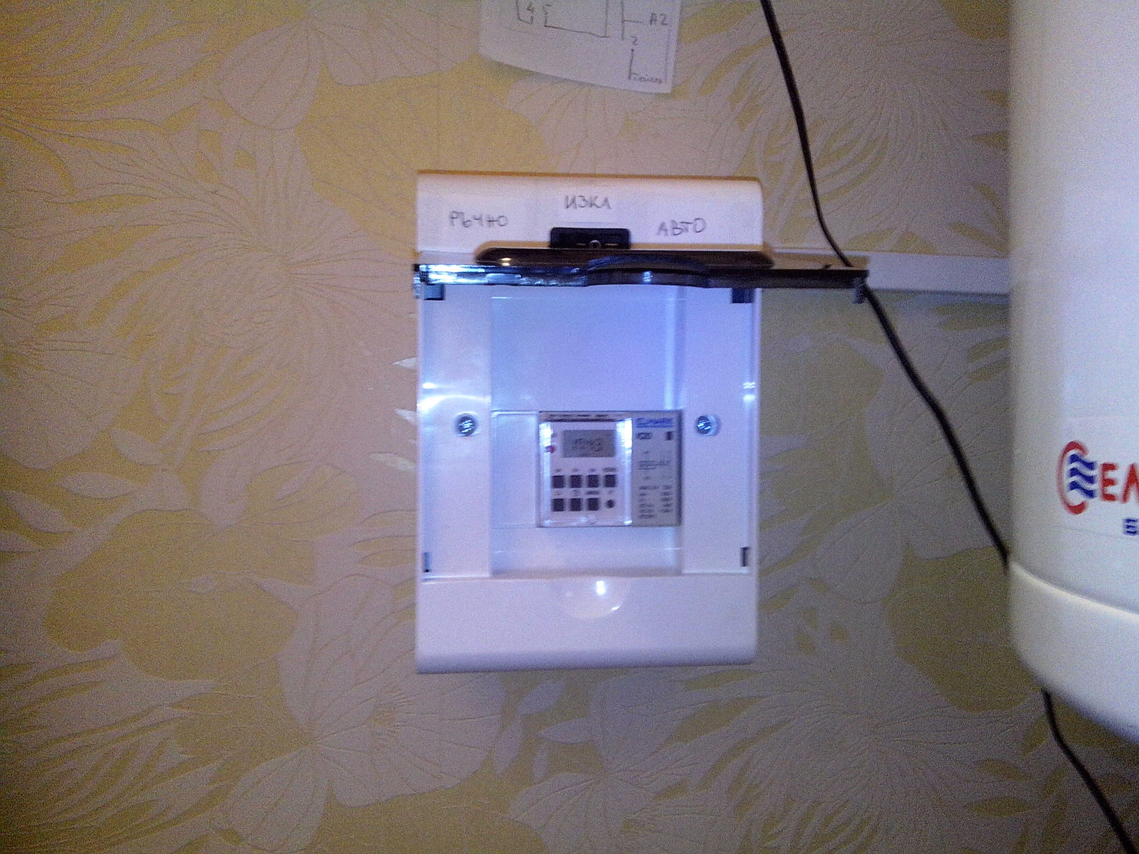 Ето още един вариант за управление на бойлер с часовник. Като часовника е от Конрад ~ 14 лв., контактор ~ 20лв, няколко Ваго клеми ~ 4 лв., кутия за ~ 4 лв и ЦК ключе за ~ 1 лв. ЦК-то байпасира часовника, освен това прекъсва и фазата към бойлера когато е в средно положение.