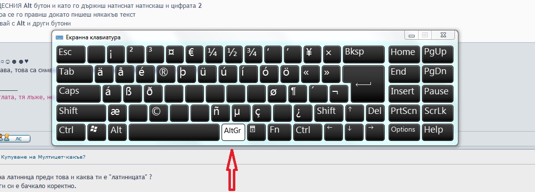 Като натиснеш десния Alt с мишката, може да видиш къде и какви допълнителни символи имаш по клавиатурата.