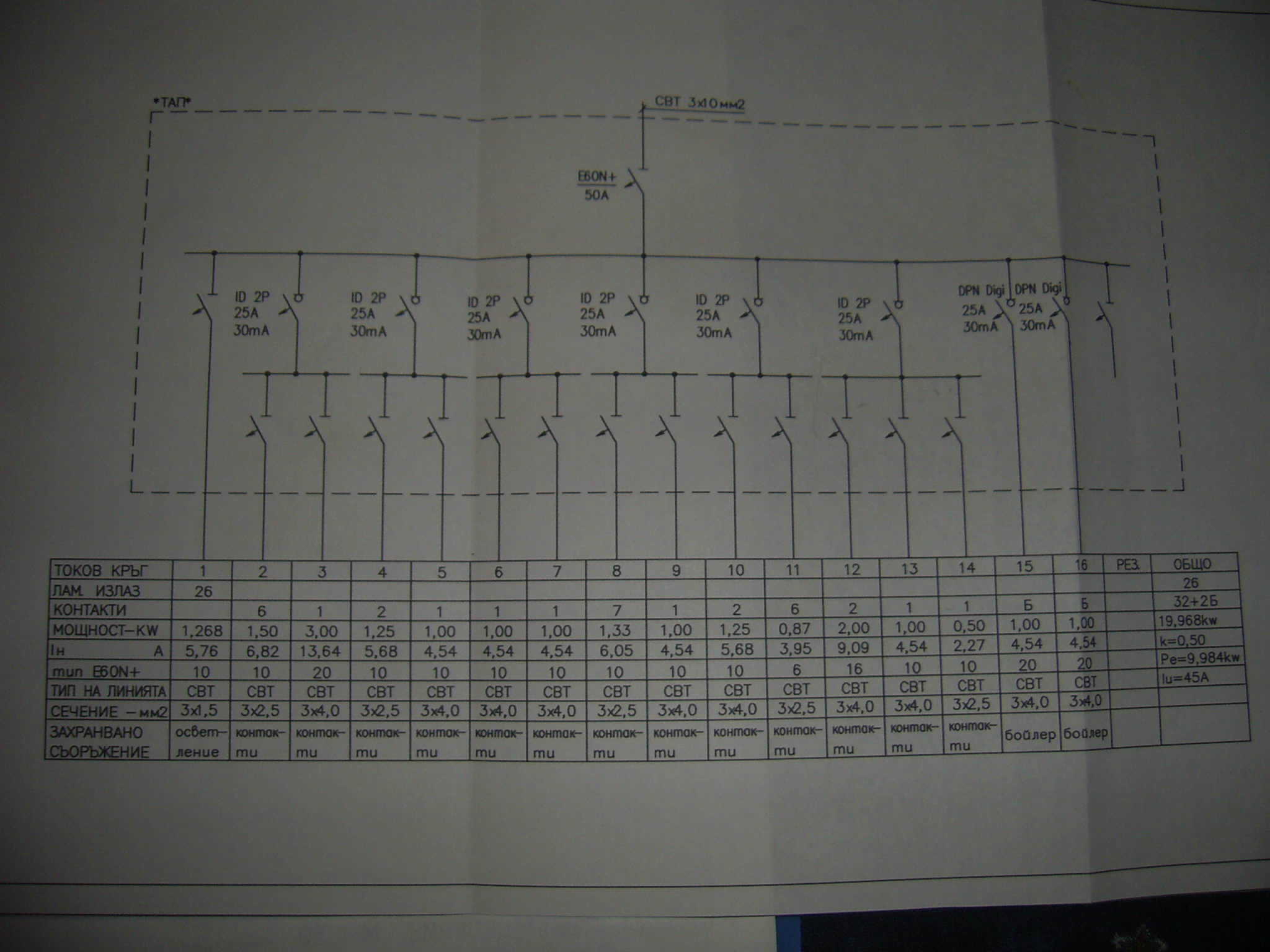 Прикачил съм вътрешното табло. Получавам ток от съсед по кабел 2х6 кв.мм Той влиза в едно външно табло на двора(има автоматичен предпазител 50А) и оттам по кабел СВТ 3*6 кв.мм достига до вътрешното табло. До вътрешното табло достига и отделен многожилен кабел, който е свързан за един метален прът забит в земята до къщата. Изпълнявам всичко по проект без промени.
