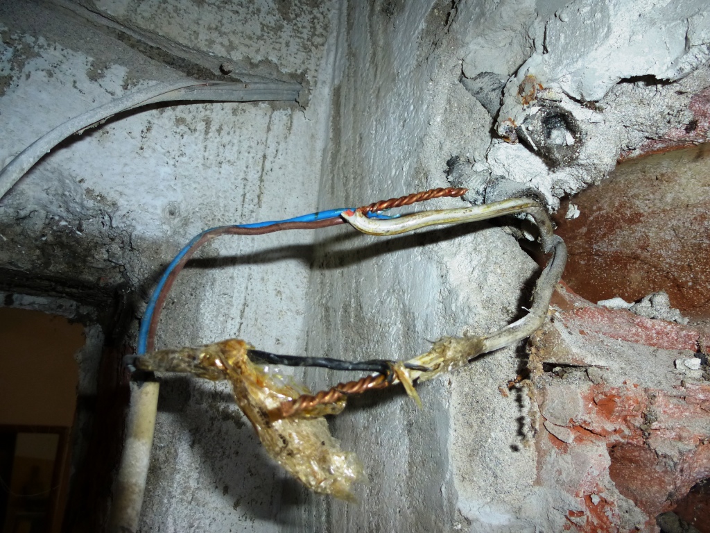 Отклонение от линия и замазано директно. Кабела се е опекъл и запалил в стената. :x
