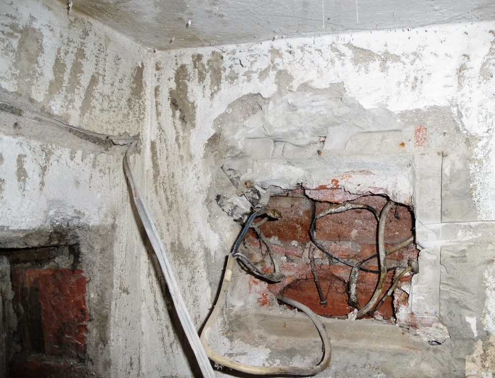 Това малко по съвременно изпълнение съдейки по PVC лентата. Отклонение от линия и замазано директно. Кабела се е опекъл и запалил в стената. Конзолата която се вижда беше запълнена с гипс и замазана от горе. Пък и за капак лепнати плочки от горе. Съжалявам че при къртенето остатъците от медните жила паднаха и нямаше как да ги снимам. Поне по обясненията да се сетите каква простотия е правена.