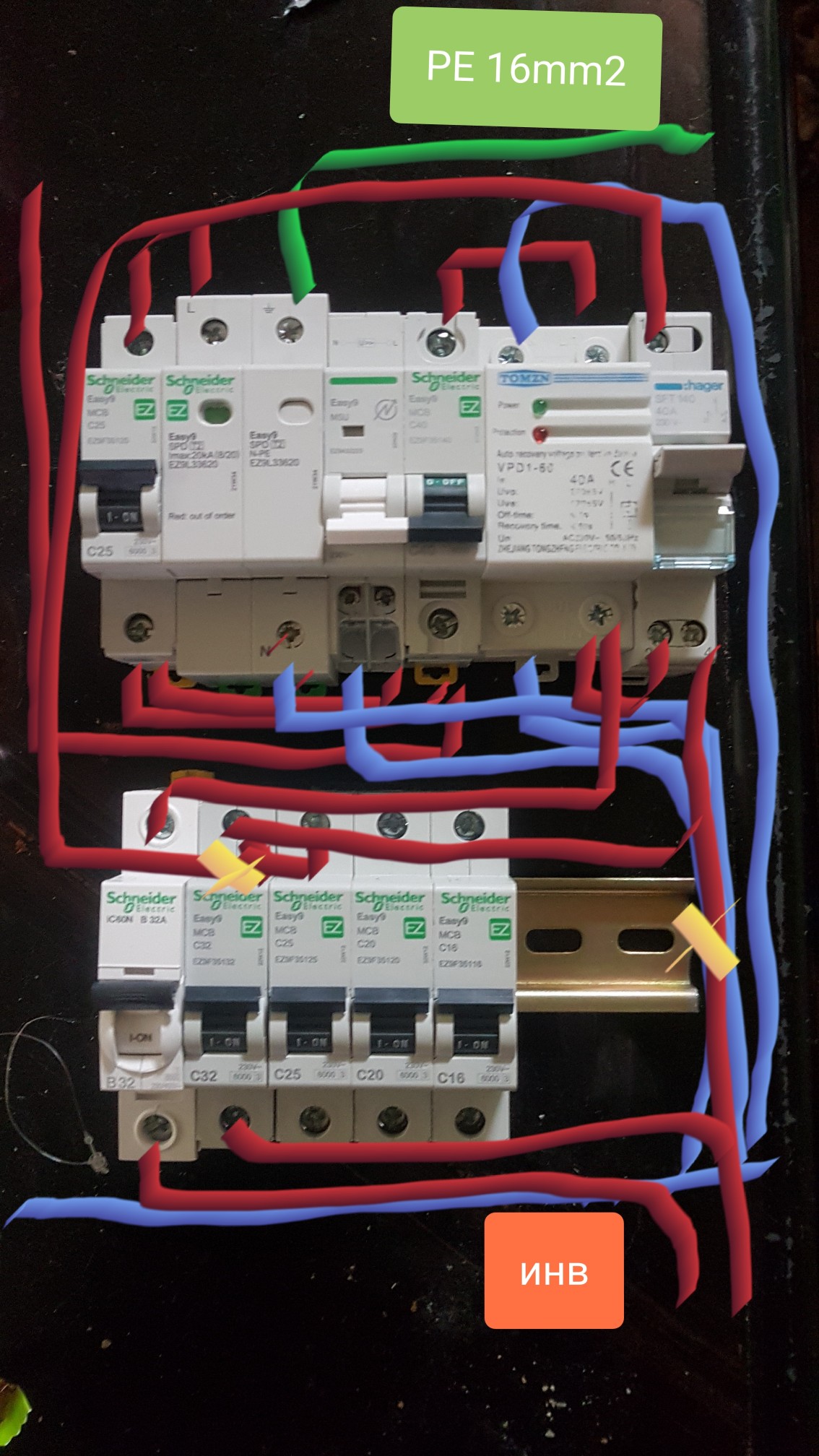 На долния ред: АП-B32a към инвертор, АП-С32 от инвертор, АП за контакти и осветление. Когато Ум шалтерът е на позиция 1 (лява клема), предпазителите към и от инвертора трябва да са изключени. Засега няма да свързвам моето земно (18 ома) с PEN, а ще го ползвам само за КО с кабел 16мм2 с дължина 5 метра до заземителния кол.