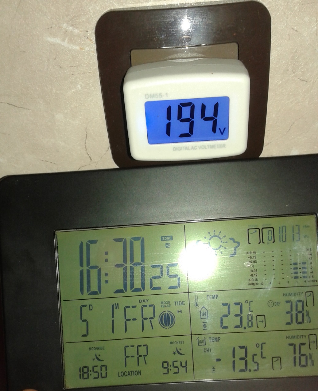 Преди 5 минути в 10:03 часа измерено в контакта. Това на снимката е конвертор от 12в. на 220 в./2 kW. за аварийни цели.