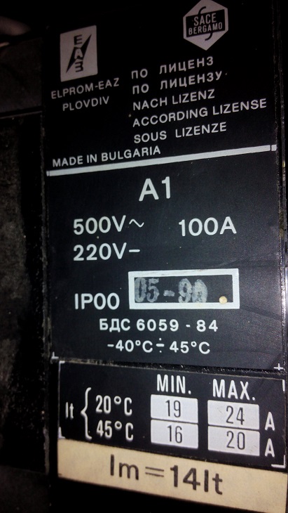 Това е табелата на А1 автомата, но съм почти убеден, че вложката в него е с нисък ампераж, понеже когато сменяхме захранващия кабел с 5х10 СВТ, старото захранване беше 4х4 СВТ и техника ми обясняваше че вложката на А1-то била за слаб ампераж,в което има логика, ако е била съобразена със сечението на проводника, но това ще го разбера в неделя, когато спрем тока за да го отворим