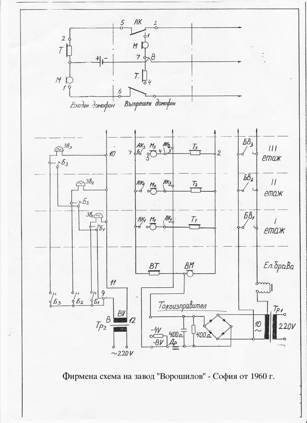 Стандартна три проводна домофонна инсталация. Слушалките и микрофоните по етажите са вързани в паралел но се включват при сваляне на гарнитурата тоест слушалката. Микрофона и слушалката на входа да го кажем с по модерната дума са кроснати спрямо другите по етажите. И понеже имат много модификации ще трябва много да се обяснява и да се види изпълнението конкретно но е лесно за разгадаването. Аз лично до сега не съм видял инсталация от това време да са ползвали допълнителния бутон за ел. ключалка. Някои от моделите си бяха със собствен трансформатор. На други се изхитриха да ползват захранване от звънчевия трансформатор. Та да не те учудва за какво е селеновия пакет. То по онова време диодите така да се каже не бяха измислени още. :lol: Това в реда на шегата но наистина по мощните диоди си бяха скъпички все още а селеновите пакети най разпространените изправители.
