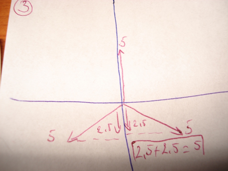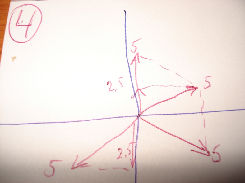 ако съберем векторите на 1 и 2 фази от получения вектор е с стойност 5ампера и с противоположна посока спрямо тока в фаза 3,който също е 5 ампера и като се съберат векторите 3 и общия межди 1 и 2 се получава нула,начертал съм го и ако се приравнят
