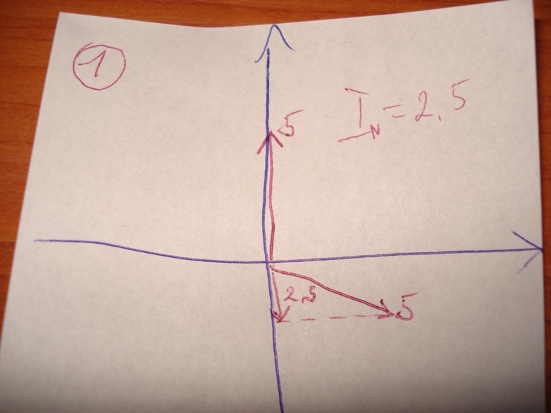 токав първа фаза е 5 ампера,тока от втората фаза приравнен към вертикалата е 2,5 ампера и като съберем векторите 5-2.5 прави 2.5 ампера