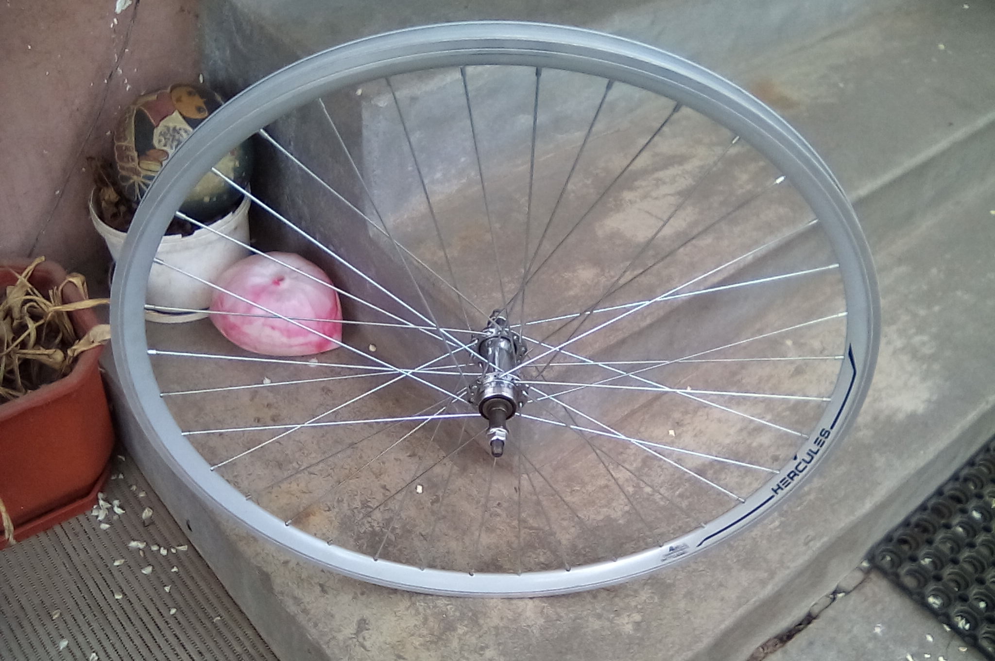 Най после каплата е готова и монтирана.Малко е грозно с две различни капли,но по натам ще сменя и предната.Къс е вентила и едвам напомпах малко гумата.Наплетох и една капла с обръч Херкулес.Каплата беше с китайска главина с контра.Преплетох я с главина с резба за скорости.Така искаше собственика на магазина с велочастите.Между другото за херкулеса програмата за спици която ползвам на таблета показа правилен размер за спиците от 282см.Може би грешното измерване на програмите се дължи на видовете профили на обръчите.Не е проблем толко,слага се най близкия размер до показаното и се пробва.Лично аз пробвах с по голям размер близък до показаното от програмата и се получи.