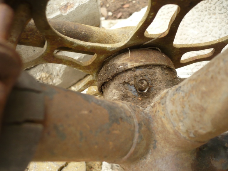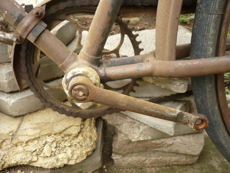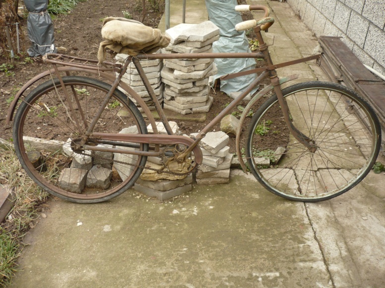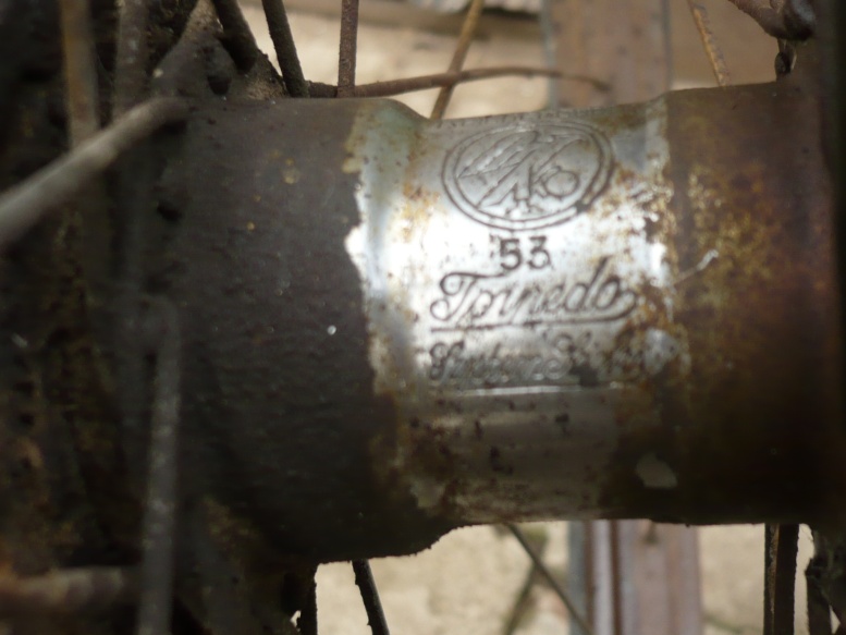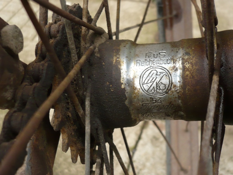 някакво колело ,няма надписи ,цялото е в ръжда ,но толкова фина,че е като боя,задната главина е Torpedo и има цифрите 53 ,което на други главини е обозначение на година на производство.