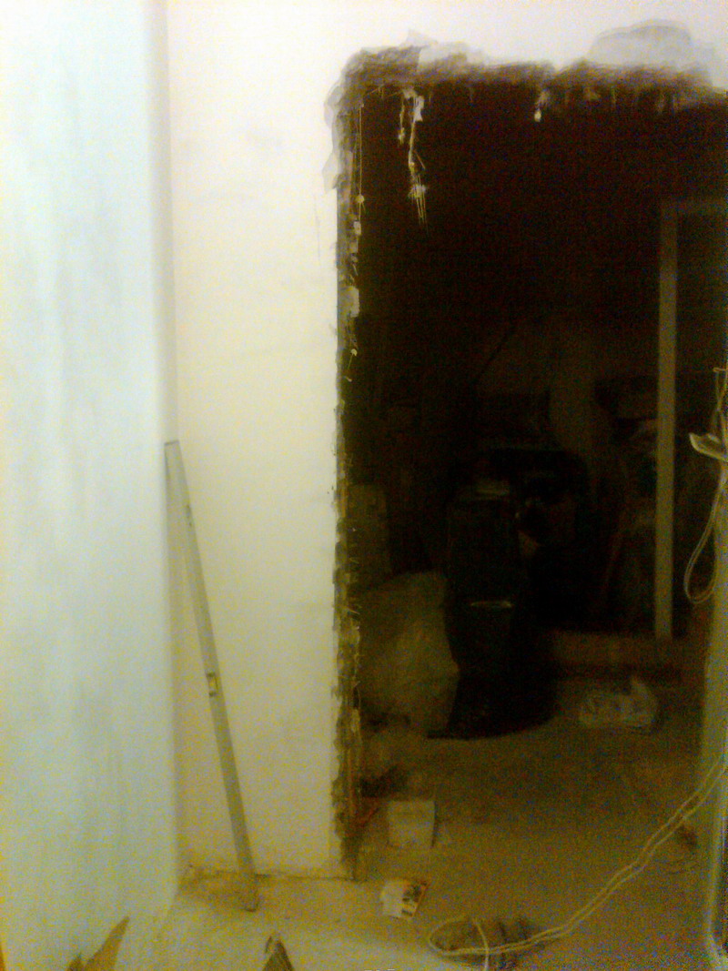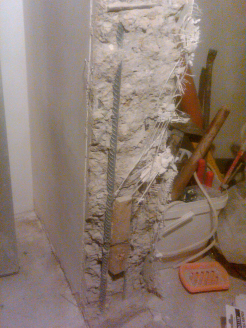 Започнах от горния ляв край - пак няма проблем, но когато стигнах до средата и почнах да слизам надолу се показа арматурата. В ъгъла виждам доста дебело желязо, което не ми пречи, от средата надолу обаче арматурата ми пречи доста (Арматурата като гледам не е вертикална, а наклонена и това е проблема)