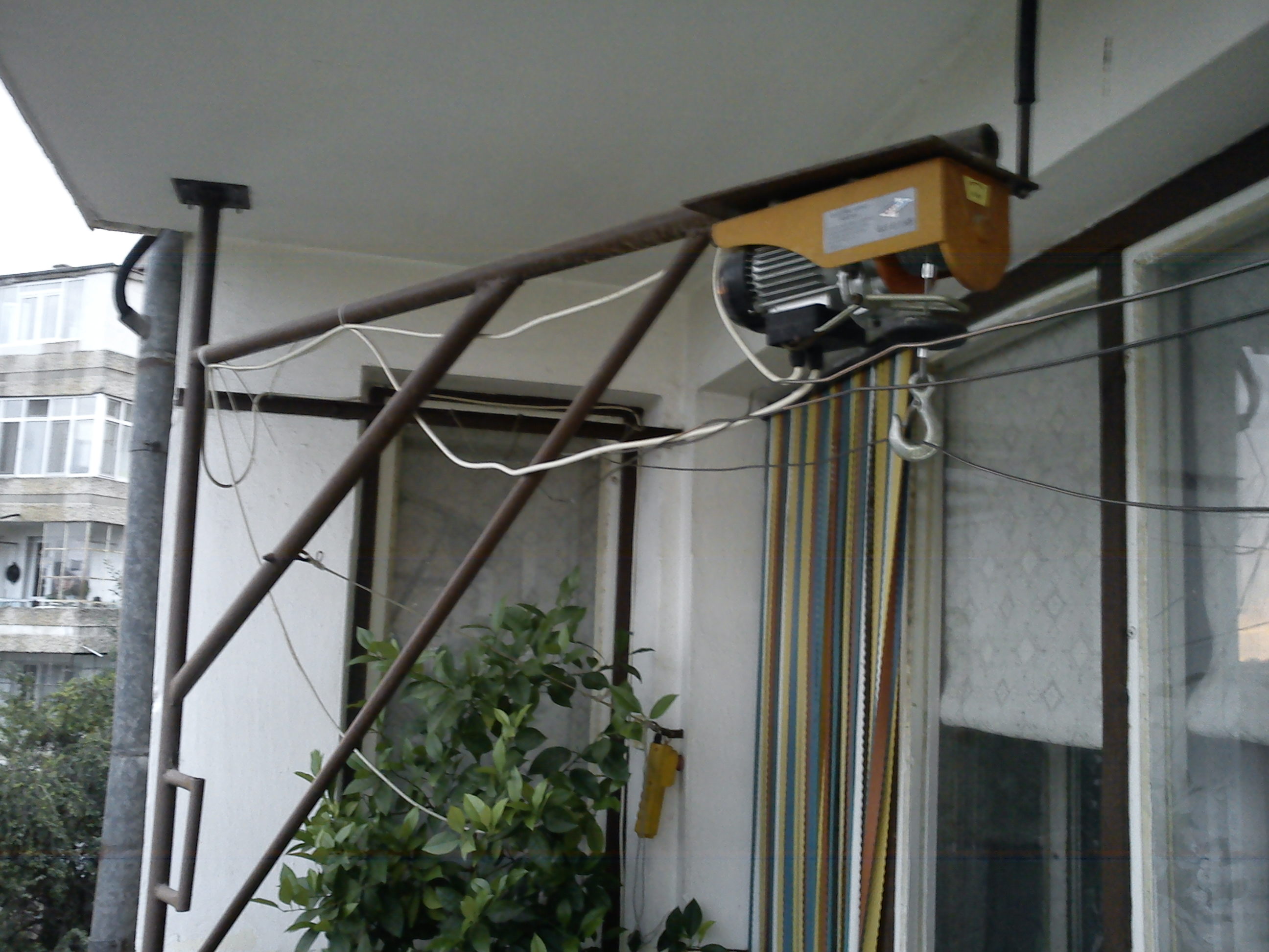 Привет,казвам се Петър от Благоевград,от скоро чета форума и ето,че ми се наложи да питам. Питането ми е:Някой има ли идея за подобно нещо.Какви ''железа'' са ми нужни,как да изглежда и кой е най-подходящия вариант за стойка,така че след работа телфера да се прибира под терасата...Телфера е от мъничките китайчета ''Райдер'',товара ще е главно дърва и въглища и ще се вдига до 3 етаж.Тераската е широка по малко от метър,мисля че беше 80см товара мисля,че ще е по малко от 100кг,така или иначе границата за товар на телфера е 125кг.
