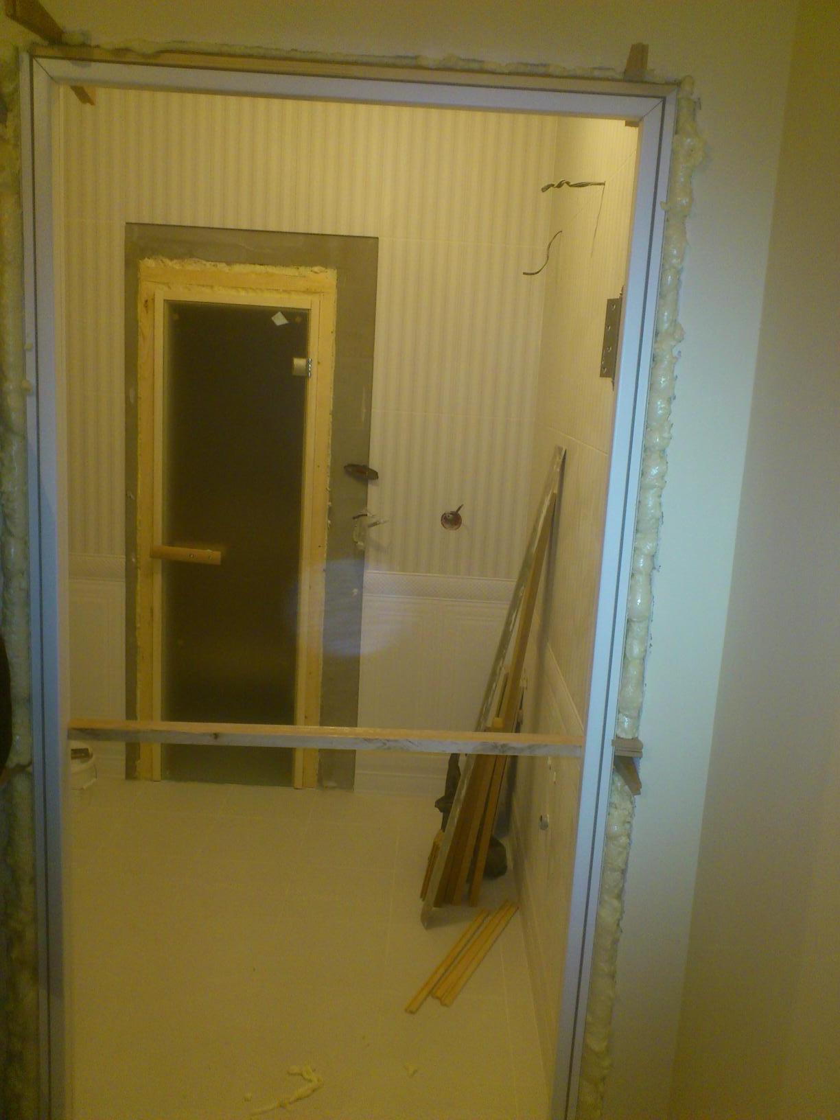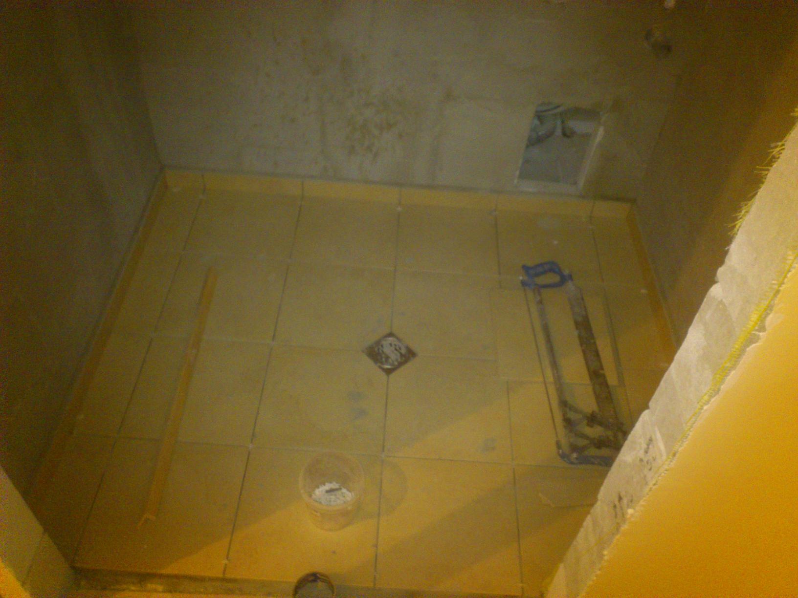пода в пералното и той чака фугата, отвора в стената е за ревизията на сифона на ваната в голямата баня.