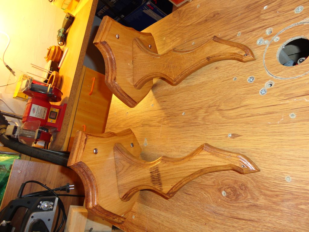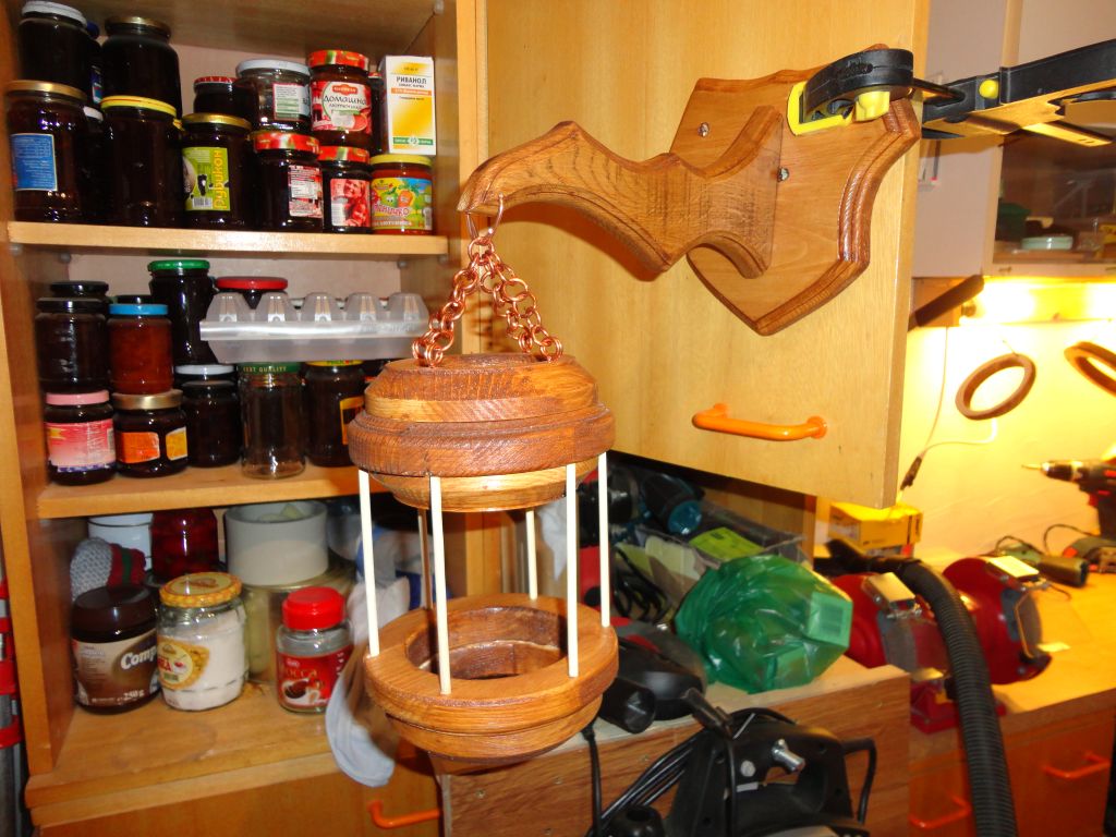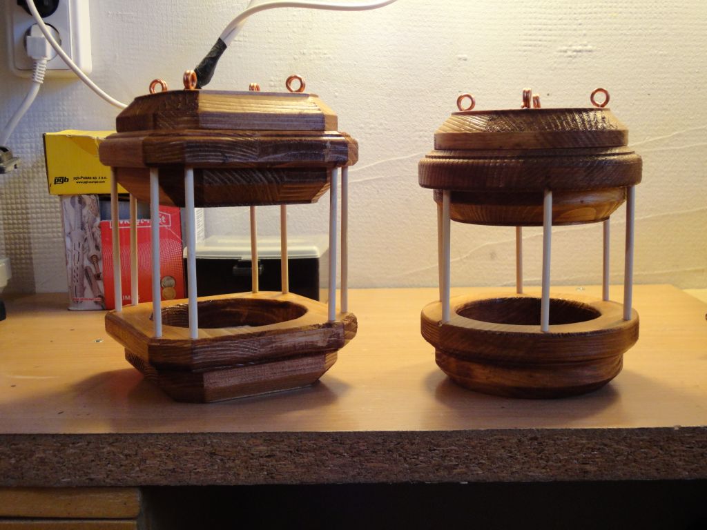 Напреднах с фенерите.Направих са проба два вида - с кръгло сечение и с квадратно сечение.По.ми хареса кръглия фенер и на вилата ще монтрам два кръгли.Квадратния ще го ползвам някъде другадеИзрязах 5 диска от чам със зегето, като изрязах и вътрешните отвори с него.После на фрезата направих профилчетата и залепих парчетата.Фасунката е керамична, Е27. Пръчиците за фенера са от бамукови шишове от магазин на 1 лев, Ф5 мм.Веригите, които държат фенера и гривните за свързването съм ги огънал от медна тел от кабел 4 кв. мм.Ето и окончателния вид на фенера.