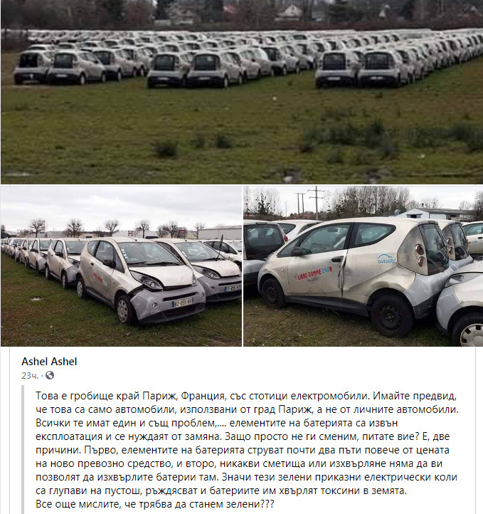 Също така не е така, че изоставените батерии на Autolib BlueCars „източват токсините в земята“. Както е отбелязано в докладите по темата, батериите са извадени от превозни средства на снимките: